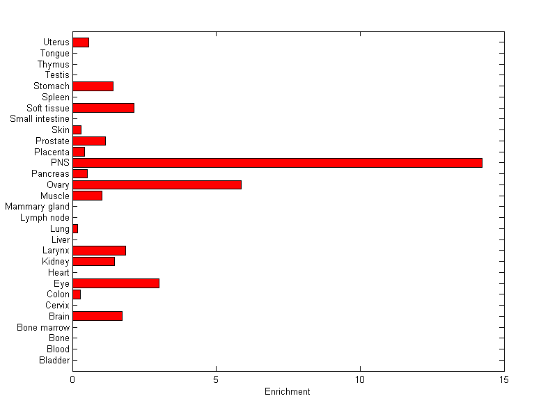 About the profile: The expression level is normalized with tissue-library size. Each value for a gene in a tissue is a ratio of observed ESTs to the expected one in this tissue. The expected number of ESTs is the product of total ESTs of the gene and the fraction of total ESTs in the tissue among all ESTs in 30 tissues. Summary: This gene is preferentially expressed in [ovary, peripheral_nervous_system] Download: |
