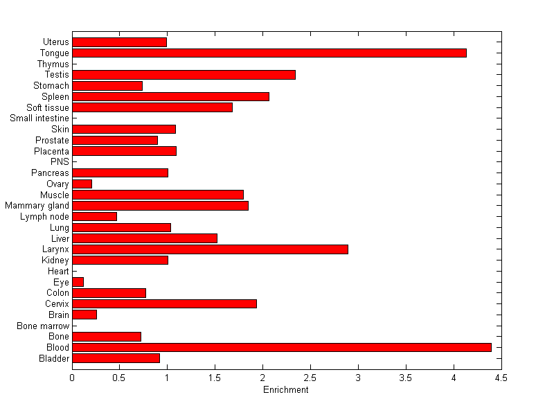 The expression level is normalized with tissue-library size. Each value for a gene in a tissue is a ratio of observed ESTs to the expected one in this tissue. The expected number of ESTs is the product of total ESTs of the gene and the fraction of total ESTs in the tissue among all ESTs in 30 tissues.