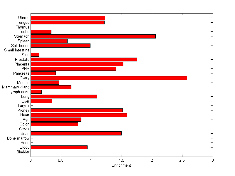 The expression level is normalized with tissue-library size. Each value for a gene in a tissue is a ratio of observed ESTs to the expected one in this tissue. The expected number of ESTs is the product of total ESTs of the gene and the fraction of total ESTs in the tissue among all ESTs in 30 tissues.