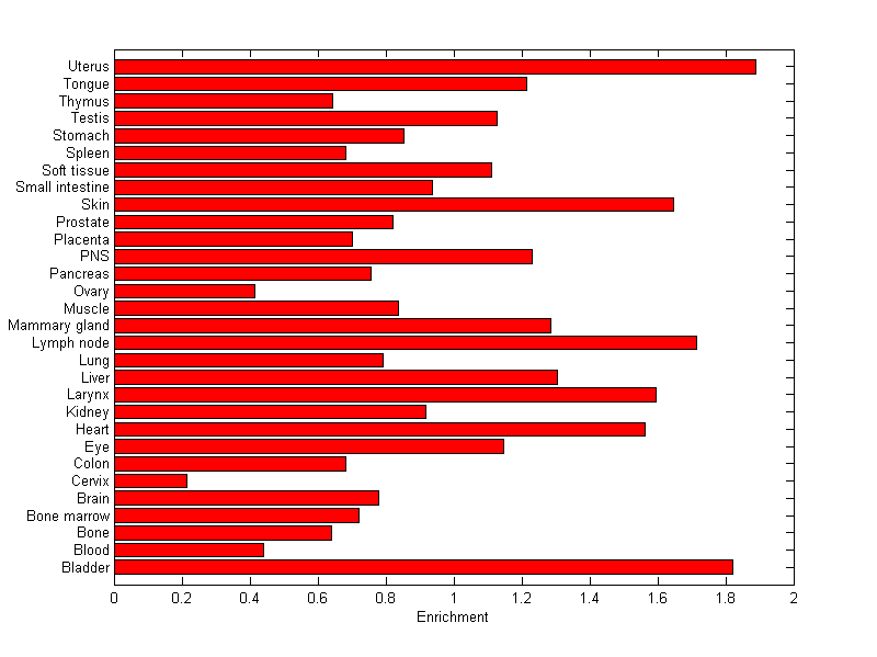 The expression level is normalized with tissue-library size. Each value for a gene in a tissue is a ratio of observed ESTs to the expected one in this tissue. The expected number of ESTs is the product of total ESTs of the gene and the fraction of total ESTs in the tissue among all ESTs in 30 tissues.