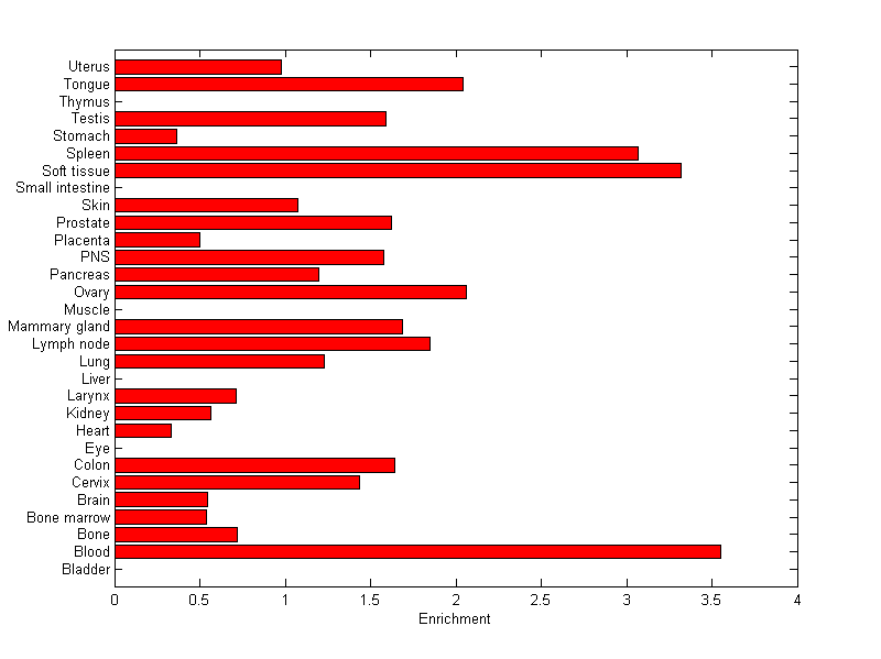 The expression level is normalized with tissue-library size. Each value for a gene in a tissue is a ratio of observed ESTs to the expected one in this tissue. The expected number of ESTs is the product of total ESTs of the gene and the fraction of total ESTs in the tissue among all ESTs in 30 tissues.