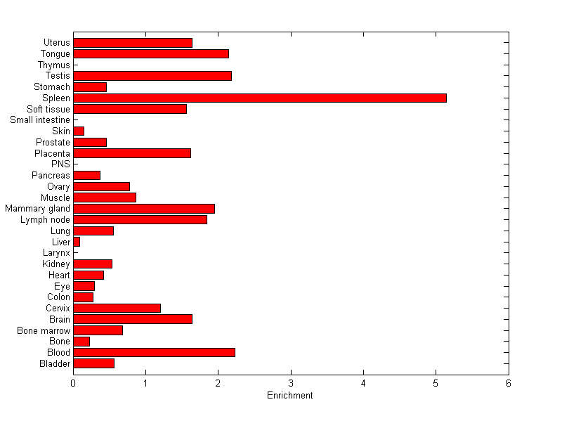 The expression level is normalized with tissue-library size. Each value for a gene in a tissue is a ratio of observed ESTs to the expected one in this tissue. The expected number of ESTs is the product of total ESTs of the gene and the fraction of total ESTs in the tissue among all ESTs in 30 tissues.