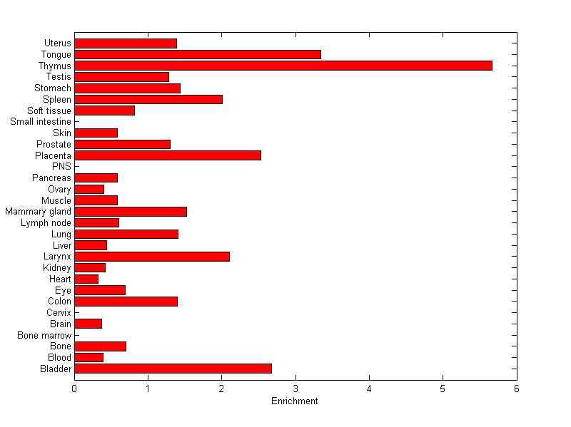 The expression level is normalized with tissue-library size. Each value for a gene in a tissue is a ratio of observed ESTs to the expected one in this tissue. The expected number of ESTs is the product of total ESTs of the gene and the fraction of total ESTs in the tissue among all ESTs in 30 tissues.