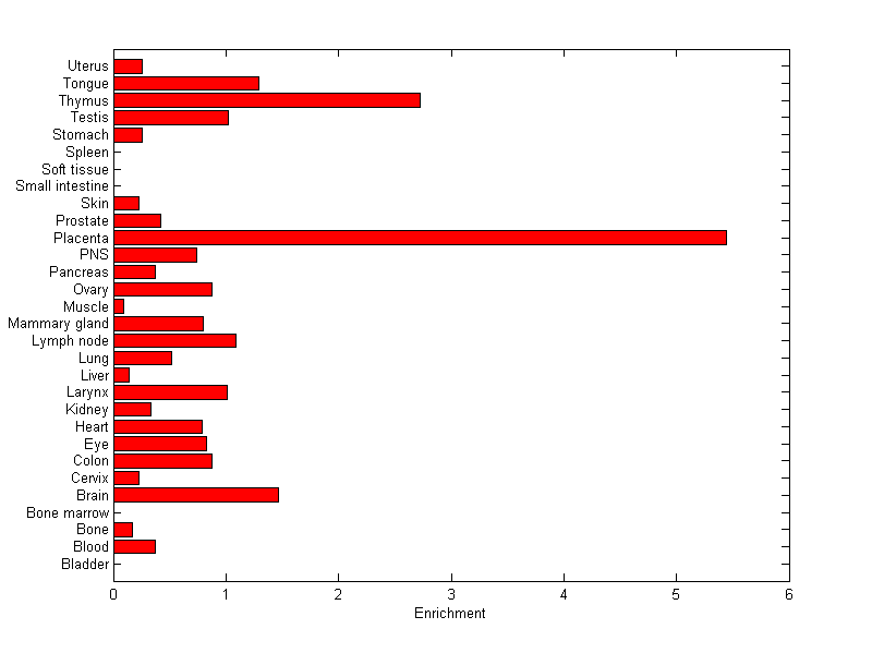 The expression level is normalized with tissue-library size. Each value for a gene in a tissue is a ratio of observed ESTs to the expected one in this tissue. The expected number of ESTs is the product of total ESTs of the gene and the fraction of total ESTs in the tissue among all ESTs in 30 tissues.