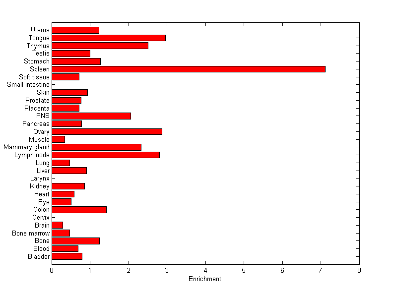 About the profile: The expression level is normalized with tissue-library size. Each value for a gene in a tissue is a ratio of observed ESTs to the expected one in this tissue. The expected number of ESTs is the product of total ESTs of the gene and the fraction of total ESTs in the tissue among all ESTs in 30 tissues. Summary: This gene is preferentially expressed in [spleen] Download: |