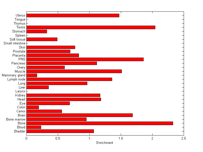 The expression level is normalized with tissue-library size. Each value for a gene in a tissue is a ratio of observed ESTs to the expected one in this tissue. The expected number of ESTs is the product of total ESTs of the gene and the fraction of total ESTs in the tissue among all ESTs in 30 tissues.