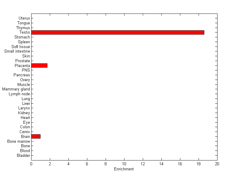 The expression level is normalized with tissue-library size. Each value for a gene in a tissue is a ratio of observed ESTs to the expected one in this tissue. The expected number of ESTs is the product of total ESTs of the gene and the fraction of total ESTs in the tissue among all ESTs in 30 tissues.