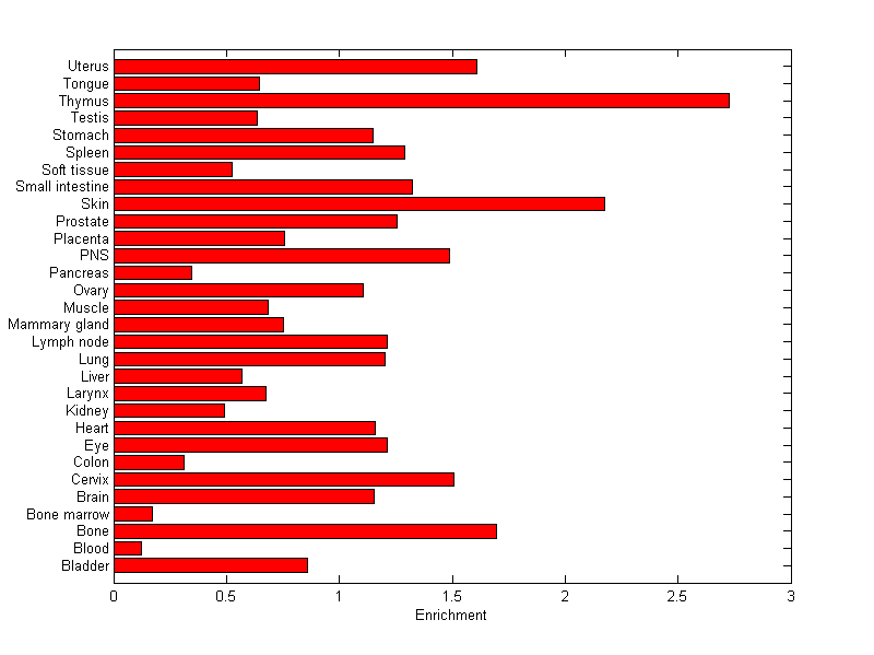 The expression level is normalized with tissue-library size. Each value for a gene in a tissue is a ratio of observed ESTs to the expected one in this tissue. The expected number of ESTs is the product of total ESTs of the gene and the fraction of total ESTs in the tissue among all ESTs in 30 tissues.