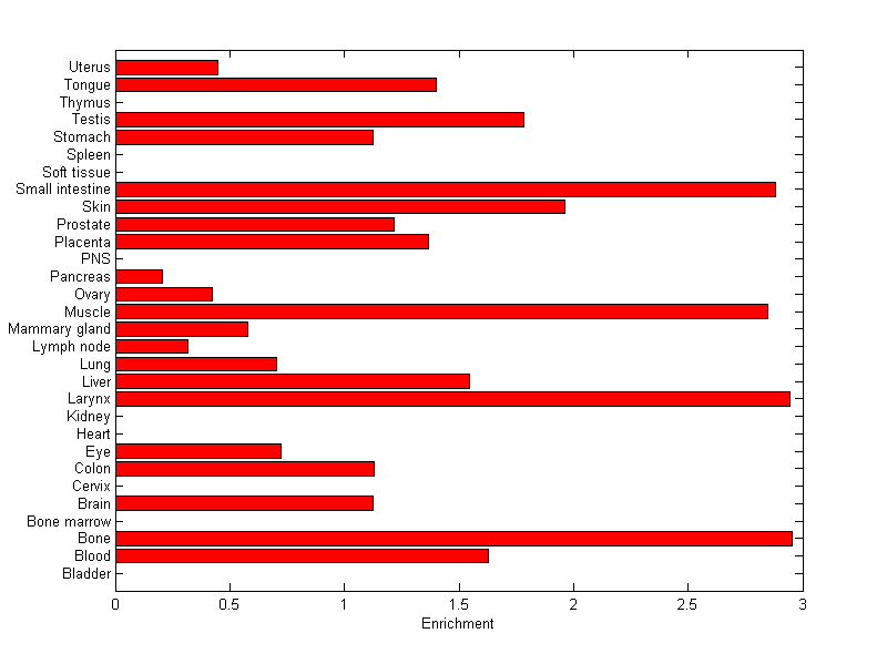 The expression level is normalized with tissue-library size. Each value for a gene in a tissue is a ratio of observed ESTs to the expected one in this tissue. The expected number of ESTs is the product of total ESTs of the gene and the fraction of total ESTs in the tissue among all ESTs in 30 tissues.