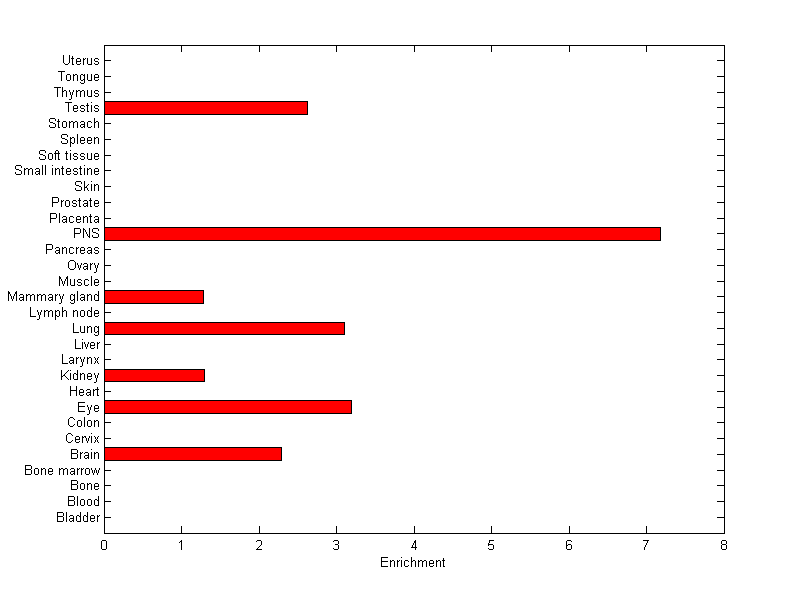 The expression level is normalized with tissue-library size. Each value for a gene in a tissue is a ratio of observed ESTs to the expected one in this tissue. The expected number of ESTs is the product of total ESTs of the gene and the fraction of total ESTs in the tissue among all ESTs in 30 tissues.