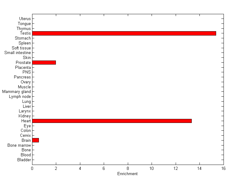 The expression level is normalized with tissue-library size. Each value for a gene in a tissue is a ratio of observed ESTs to the expected one in this tissue. The expected number of ESTs is the product of total ESTs of the gene and the fraction of total ESTs in the tissue among all ESTs in 30 tissues.
