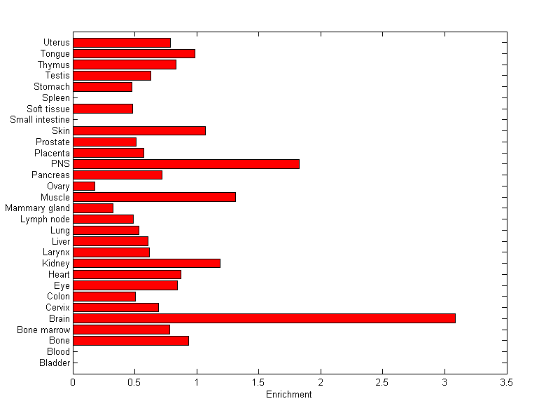 The expression level is normalized with tissue-library size. Each value for a gene in a tissue is a ratio of observed ESTs to the expected one in this tissue. The expected number of ESTs is the product of total ESTs of the gene and the fraction of total ESTs in the tissue among all ESTs in 30 tissues.