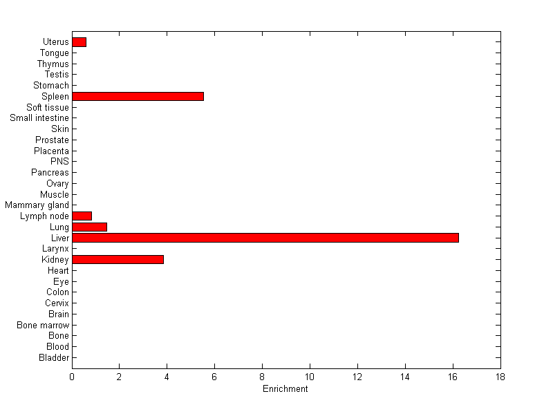 The expression level is normalized with tissue-library size. Each value for a gene in a tissue is a ratio of observed ESTs to the expected one in this tissue. The expected number of ESTs is the product of total ESTs of the gene and the fraction of total ESTs in the tissue among all ESTs in 30 tissues.