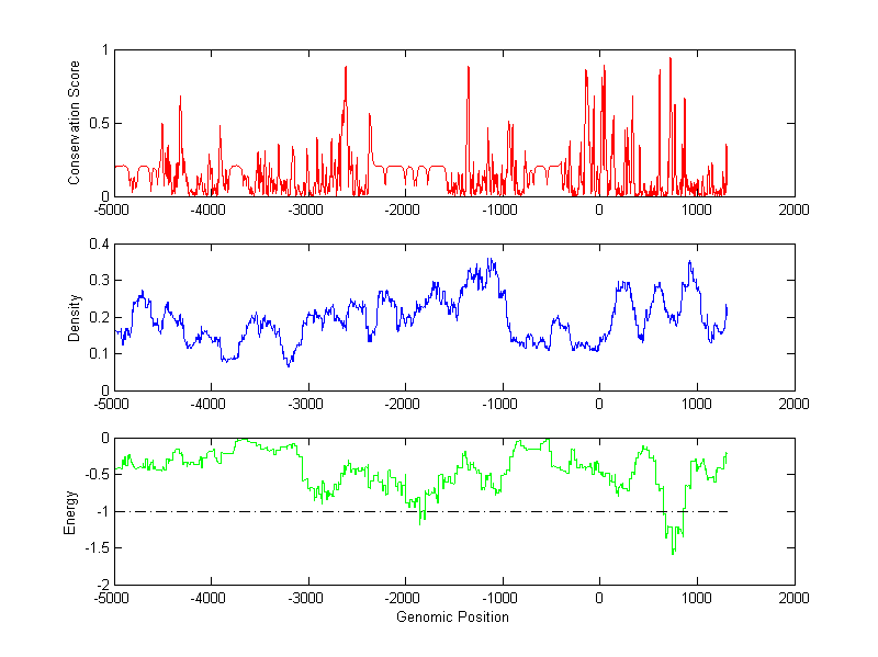The energy profile (green curve) is about energy for module detection based on TF interaction. The positions with energy less than -1 indicate the existence of CRMs.