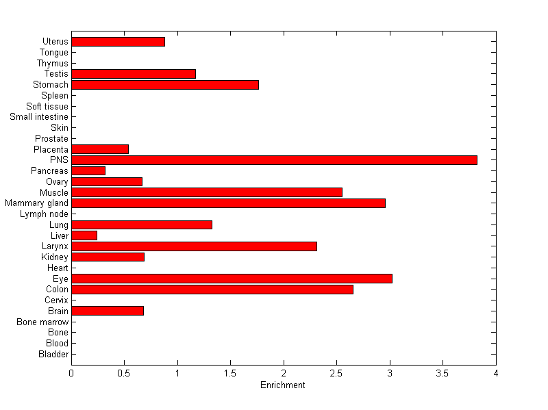 The expression level is normalized with tissue-library size. Each value for a gene in a tissue is a ratio of observed ESTs to the expected one in this tissue. The expected number of ESTs is the product of total ESTs of the gene and the fraction of total ESTs in the tissue among all ESTs in 30 tissues.
