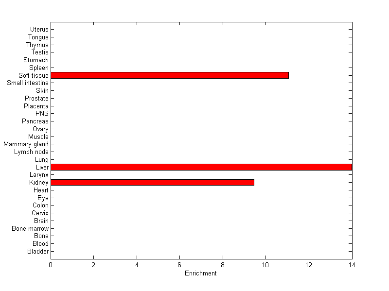 The expression level is normalized with tissue-library size. Each value for a gene in a tissue is a ratio of observed ESTs to the expected one in this tissue. The expected number of ESTs is the product of total ESTs of the gene and the fraction of total ESTs in the tissue among all ESTs in 30 tissues.
