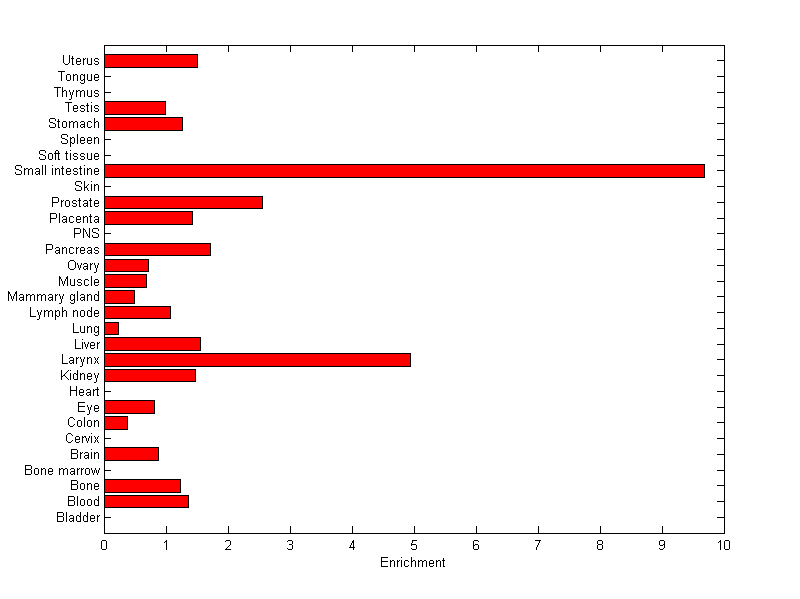 The expression level is normalized with tissue-library size. Each value for a gene in a tissue is a ratio of observed ESTs to the expected one in this tissue. The expected number of ESTs is the product of total ESTs of the gene and the fraction of total ESTs in the tissue among all ESTs in 30 tissues.