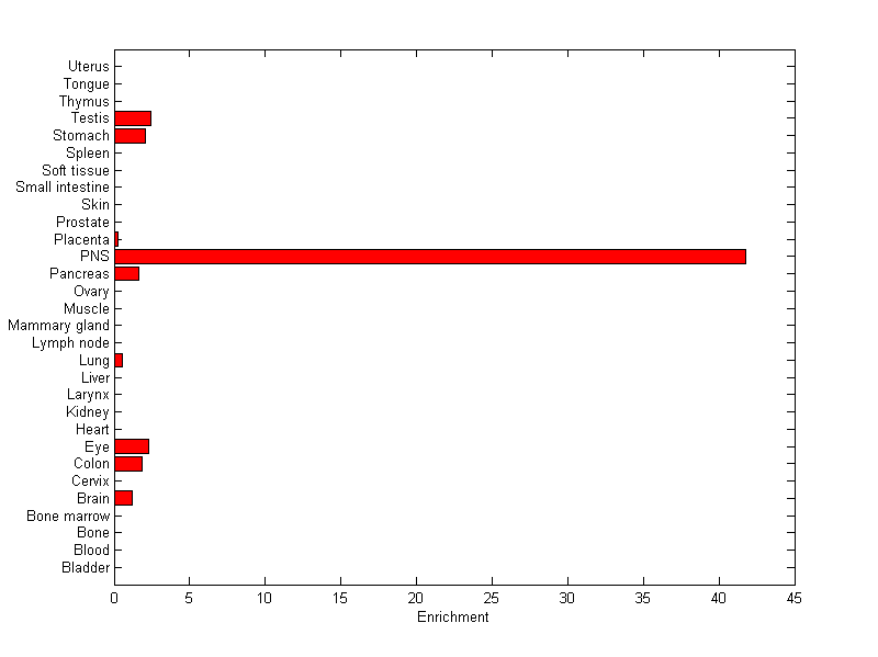 The expression level is normalized with tissue-library size. Each value for a gene in a tissue is a ratio of observed ESTs to the expected one in this tissue. The expected number of ESTs is the product of total ESTs of the gene and the fraction of total ESTs in the tissue among all ESTs in 30 tissues.