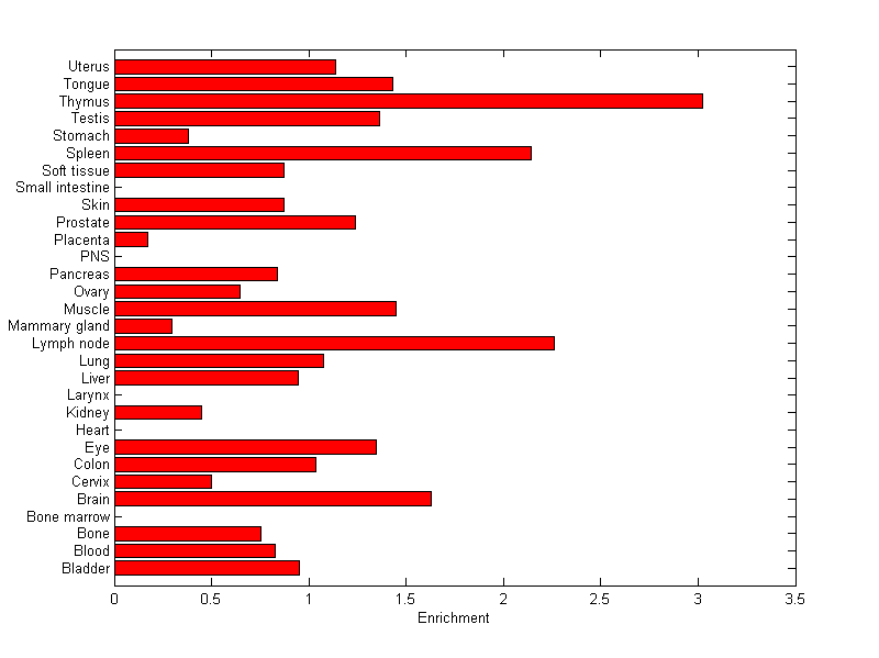 The expression level is normalized with tissue-library size. Each value for a gene in a tissue is a ratio of observed ESTs to the expected one in this tissue. The expected number of ESTs is the product of total ESTs of the gene and the fraction of total ESTs in the tissue among all ESTs in 30 tissues.