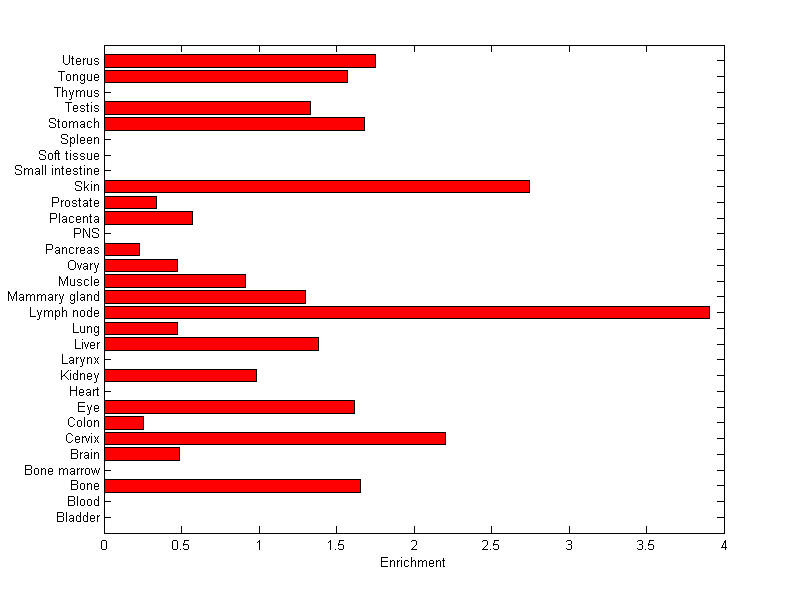 The expression level is normalized with tissue-library size. Each value for a gene in a tissue is a ratio of observed ESTs to the expected one in this tissue. The expected number of ESTs is the product of total ESTs of the gene and the fraction of total ESTs in the tissue among all ESTs in 30 tissues.
