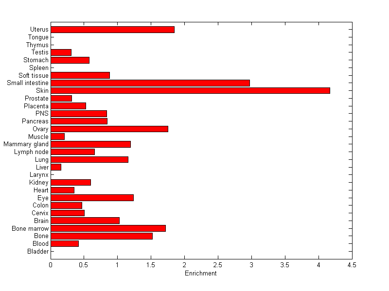 The expression level is normalized with tissue-library size. Each value for a gene in a tissue is a ratio of observed ESTs to the expected one in this tissue. The expected number of ESTs is the product of total ESTs of the gene and the fraction of total ESTs in the tissue among all ESTs in 30 tissues.