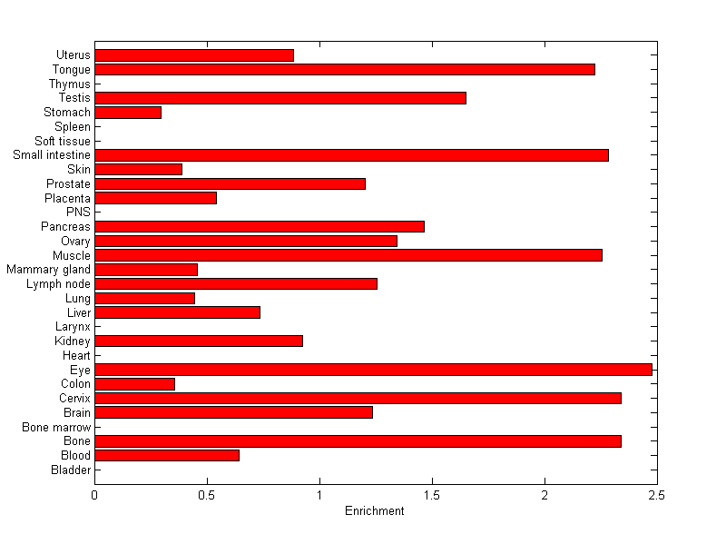 The expression level is normalized with tissue-library size. Each value for a gene in a tissue is a ratio of observed ESTs to the expected one in this tissue. The expected number of ESTs is the product of total ESTs of the gene and the fraction of total ESTs in the tissue among all ESTs in 30 tissues.