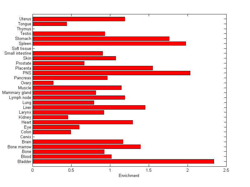 The expression level is normalized with tissue-library size. Each value for a gene in a tissue is a ratio of observed ESTs to the expected one in this tissue. The expected number of ESTs is the product of total ESTs of the gene and the fraction of total ESTs in the tissue among all ESTs in 30 tissues.