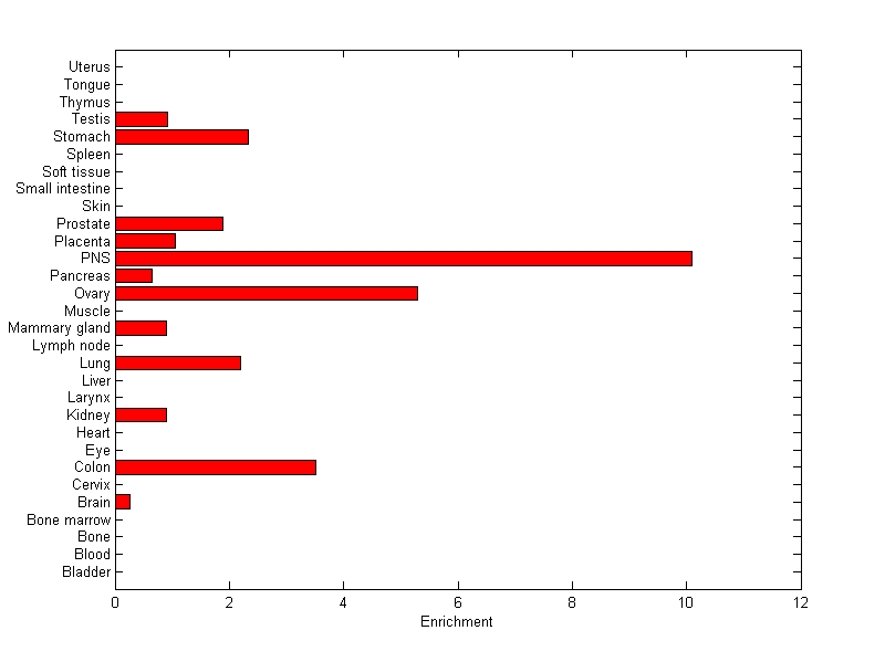 The expression level is normalized with tissue-library size. Each value for a gene in a tissue is a ratio of observed ESTs to the expected one in this tissue. The expected number of ESTs is the product of total ESTs of the gene and the fraction of total ESTs in the tissue among all ESTs in 30 tissues.