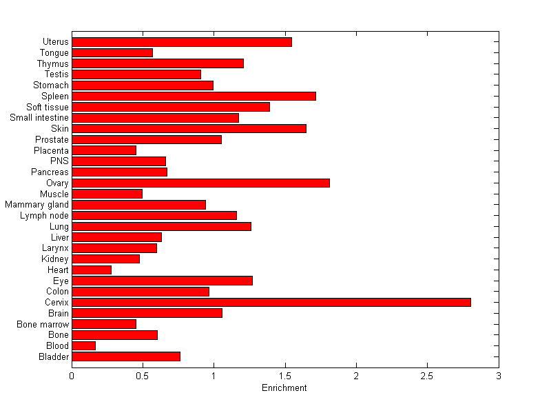 The expression level is normalized with tissue-library size. Each value for a gene in a tissue is a ratio of observed ESTs to the expected one in this tissue. The expected number of ESTs is the product of total ESTs of the gene and the fraction of total ESTs in the tissue among all ESTs in 30 tissues.
