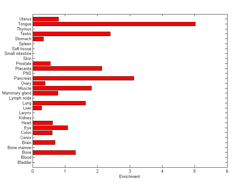 The expression level is normalized with tissue-library size. Each value for a gene in a tissue is a ratio of observed ESTs to the expected one in this tissue. The expected number of ESTs is the product of total ESTs of the gene and the fraction of total ESTs in the tissue among all ESTs in 30 tissues.