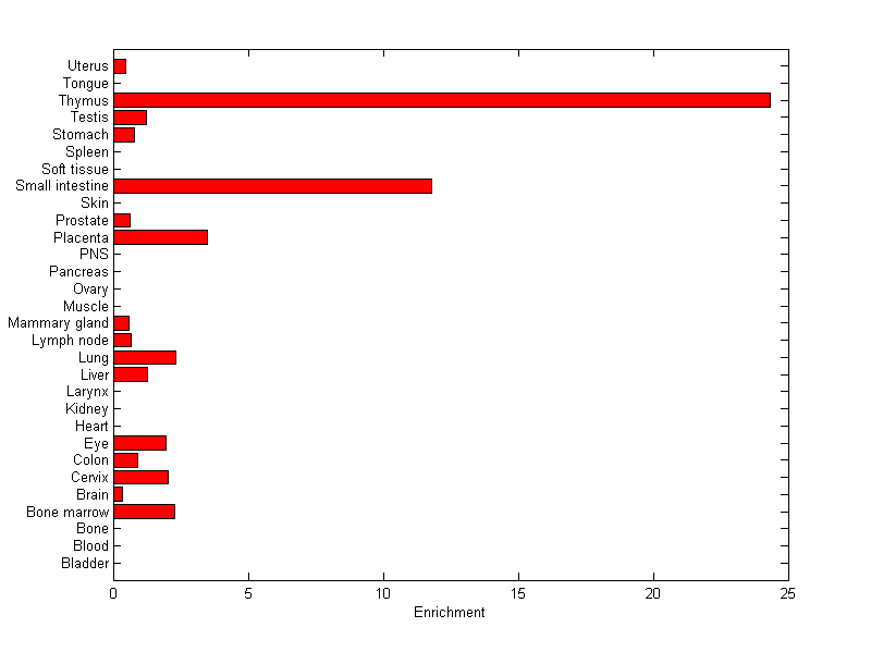 The expression level is normalized with tissue-library size. Each value for a gene in a tissue is a ratio of observed ESTs to the expected one in this tissue. The expected number of ESTs is the product of total ESTs of the gene and the fraction of total ESTs in the tissue among all ESTs in 30 tissues.