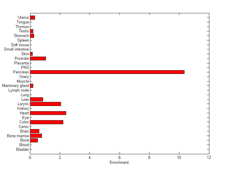The expression level is normalized with tissue-library size. Each value for a gene in a tissue is a ratio of observed ESTs to the expected one in this tissue. The expected number of ESTs is the product of total ESTs of the gene and the fraction of total ESTs in the tissue among all ESTs in 30 tissues.