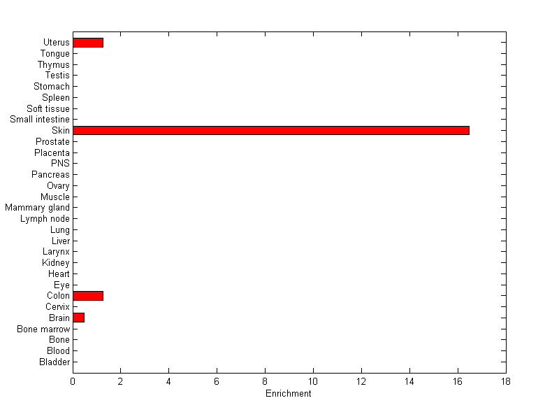 The expression level is normalized with tissue-library size. Each value for a gene in a tissue is a ratio of observed ESTs to the expected one in this tissue. The expected number of ESTs is the product of total ESTs of the gene and the fraction of total ESTs in the tissue among all ESTs in 30 tissues.