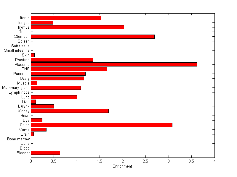 The expression level is normalized with tissue-library size. Each value for a gene in a tissue is a ratio of observed ESTs to the expected one in this tissue. The expected number of ESTs is the product of total ESTs of the gene and the fraction of total ESTs in the tissue among all ESTs in 30 tissues.
