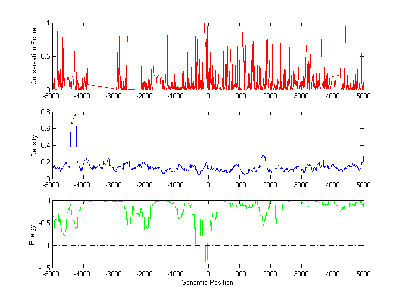 About the profiles: The conservation profile (red curve) is about conservation scores of the promoter sequences. Conservation was determined from an eight-way alignment of human, chimpanzee, dog, mouse, rat, chicken, zebrafish and fugu sequences. The conservation was quantified by a conservation score between 0 and 1, with 1 as highest conservation. The conservation score was obtained from UCSC genome databases. The density profile (blue curve) is about density of all TF binding sites. The energy profile (green curve) is about energy for module detection based on TF interaction. The positions with energy less than -1 indicate the existence of CRMs. Download: Conservation profileDensity profile Energy profile CRM summary |