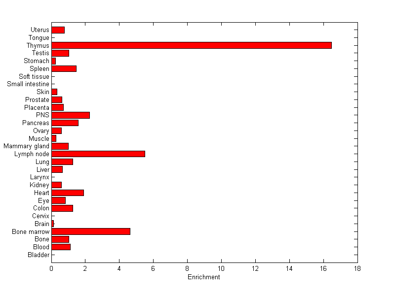 About the profile: The expression level is normalized with tissue-library size. Each value for a gene in a tissue is a ratio of observed ESTs to the expected one in this tissue. The expected number of ESTs is the product of total ESTs of the gene and the fraction of total ESTs in the tissue among all ESTs in 30 tissues. Summary: This gene is preferentially expressed in [lymph_node, thymus] Download: |