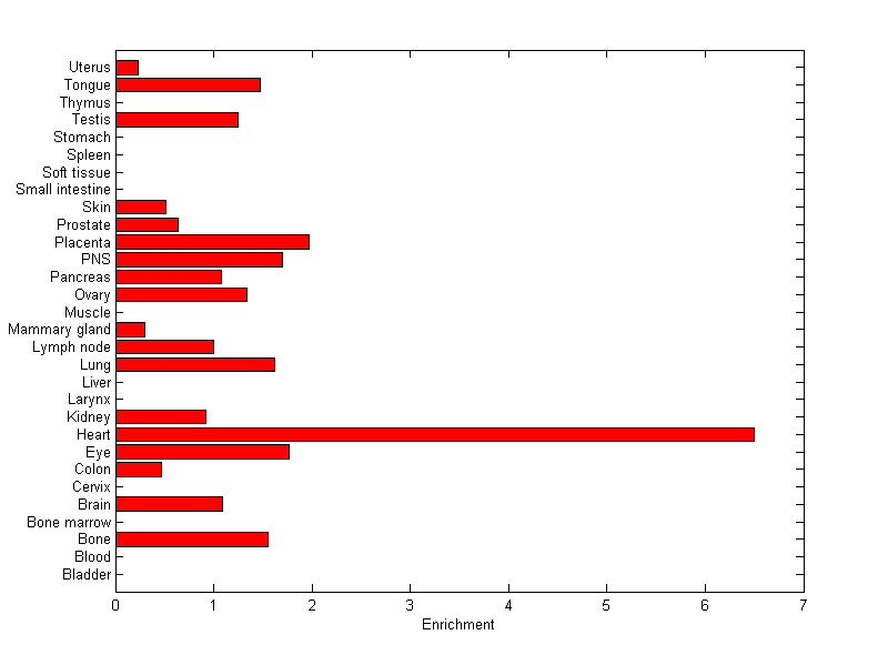 The expression level is normalized with tissue-library size. Each value for a gene in a tissue is a ratio of observed ESTs to the expected one in this tissue. The expected number of ESTs is the product of total ESTs of the gene and the fraction of total ESTs in the tissue among all ESTs in 30 tissues.