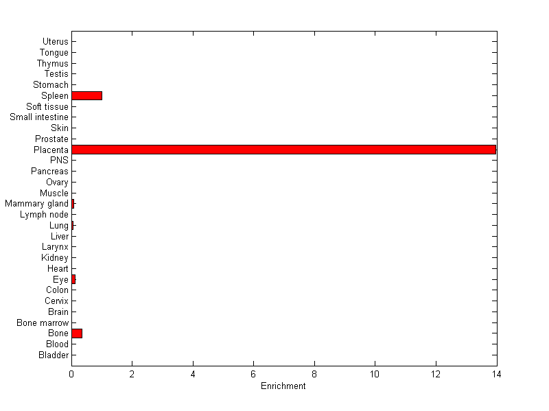 The expression level is normalized with tissue-library size. Each value for a gene in a tissue is a ratio of observed ESTs to the expected one in this tissue. The expected number of ESTs is the product of total ESTs of the gene and the fraction of total ESTs in the tissue among all ESTs in 30 tissues.