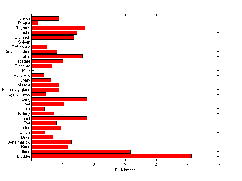 The expression level is normalized with tissue-library size. Each value for a gene in a tissue is a ratio of observed ESTs to the expected one in this tissue. The expected number of ESTs is the product of total ESTs of the gene and the fraction of total ESTs in the tissue among all ESTs in 30 tissues.