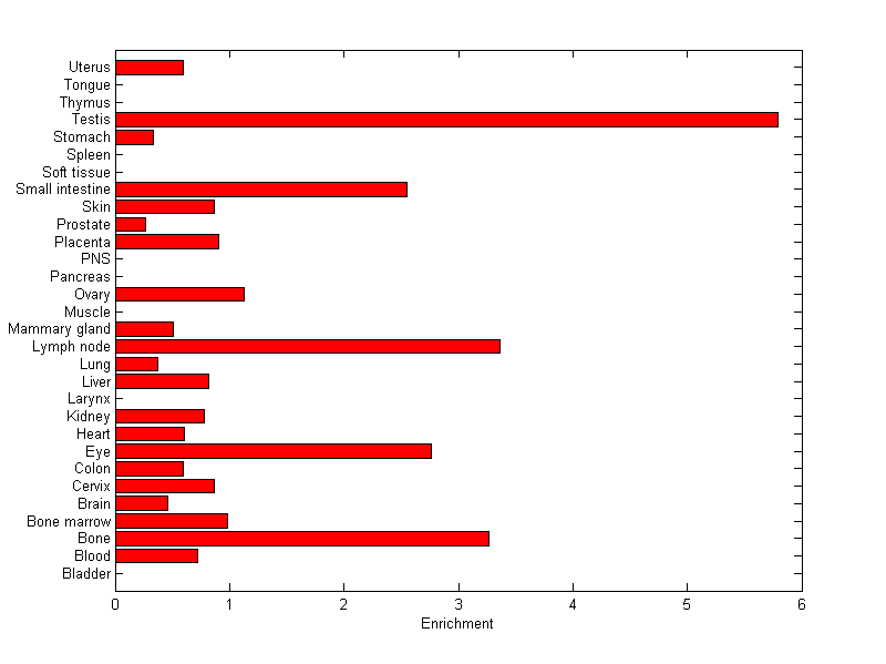 The expression level is normalized with tissue-library size. Each value for a gene in a tissue is a ratio of observed ESTs to the expected one in this tissue. The expected number of ESTs is the product of total ESTs of the gene and the fraction of total ESTs in the tissue among all ESTs in 30 tissues.