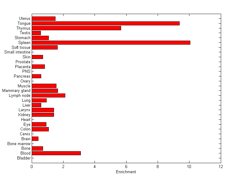 About the profile: The expression level is normalized with tissue-library size. Each value for a gene in a tissue is a ratio of observed ESTs to the expected one in this tissue. The expected number of ESTs is the product of total ESTs of the gene and the fraction of total ESTs in the tissue among all ESTs in 30 tissues. Summary: This gene is preferentially expressed in [spleen, tongue] Download: |