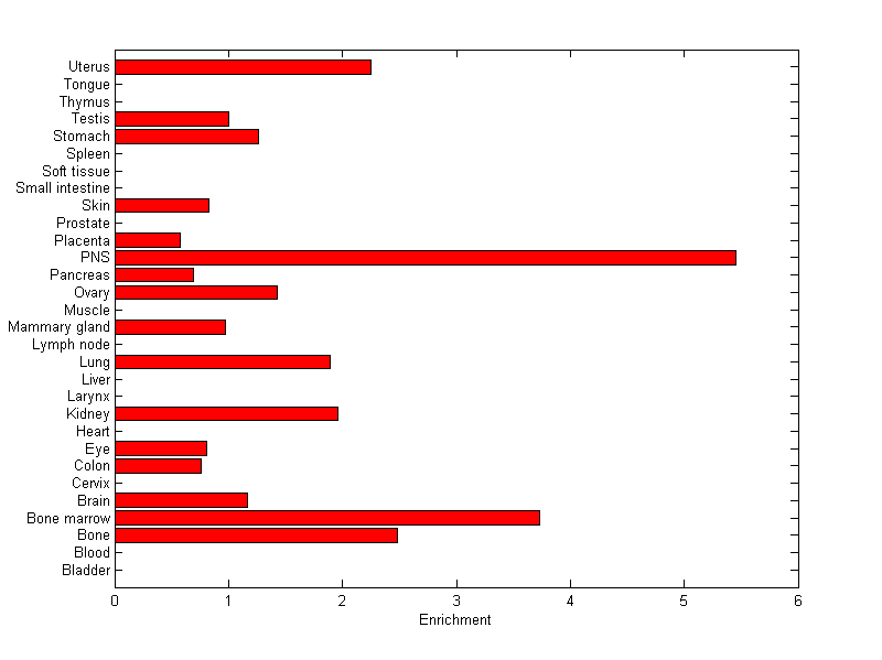 The expression level is normalized with tissue-library size. Each value for a gene in a tissue is a ratio of observed ESTs to the expected one in this tissue. The expected number of ESTs is the product of total ESTs of the gene and the fraction of total ESTs in the tissue among all ESTs in 30 tissues.