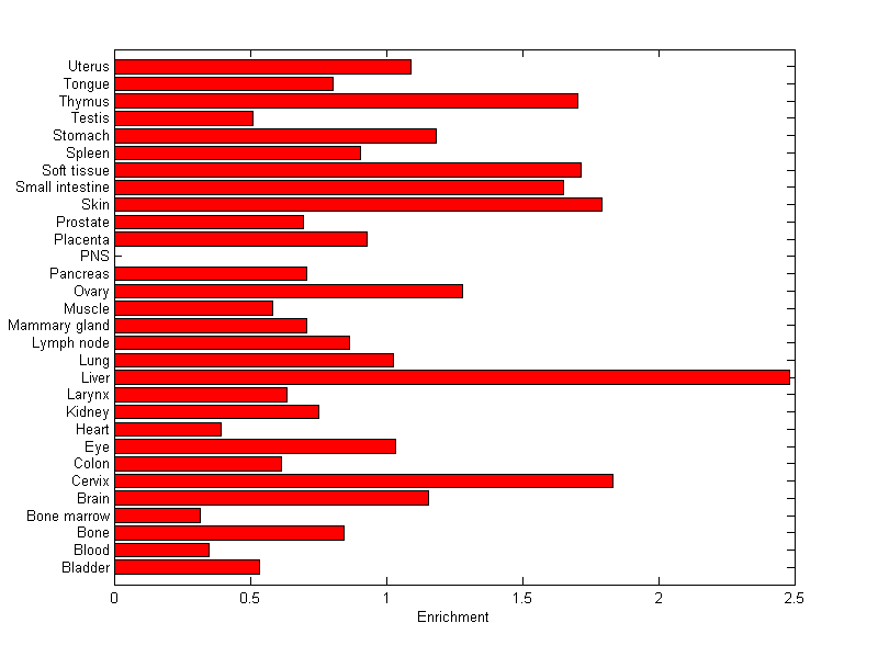 The expression level is normalized with tissue-library size. Each value for a gene in a tissue is a ratio of observed ESTs to the expected one in this tissue. The expected number of ESTs is the product of total ESTs of the gene and the fraction of total ESTs in the tissue among all ESTs in 30 tissues.