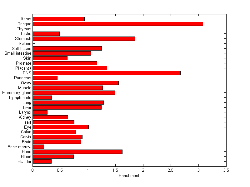 The expression level is normalized with tissue-library size. Each value for a gene in a tissue is a ratio of observed ESTs to the expected one in this tissue. The expected number of ESTs is the product of total ESTs of the gene and the fraction of total ESTs in the tissue among all ESTs in 30 tissues.