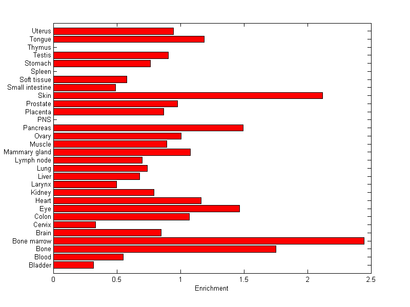 The expression level is normalized with tissue-library size. Each value for a gene in a tissue is a ratio of observed ESTs to the expected one in this tissue. The expected number of ESTs is the product of total ESTs of the gene and the fraction of total ESTs in the tissue among all ESTs in 30 tissues.