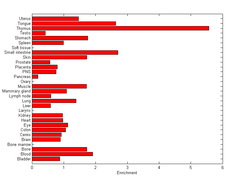 The expression level is normalized with tissue-library size. Each value for a gene in a tissue is a ratio of observed ESTs to the expected one in this tissue. The expected number of ESTs is the product of total ESTs of the gene and the fraction of total ESTs in the tissue among all ESTs in 30 tissues.