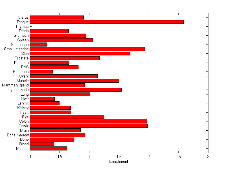 The expression level is normalized with tissue-library size. Each value for a gene in a tissue is a ratio of observed ESTs to the expected one in this tissue. The expected number of ESTs is the product of total ESTs of the gene and the fraction of total ESTs in the tissue among all ESTs in 30 tissues.