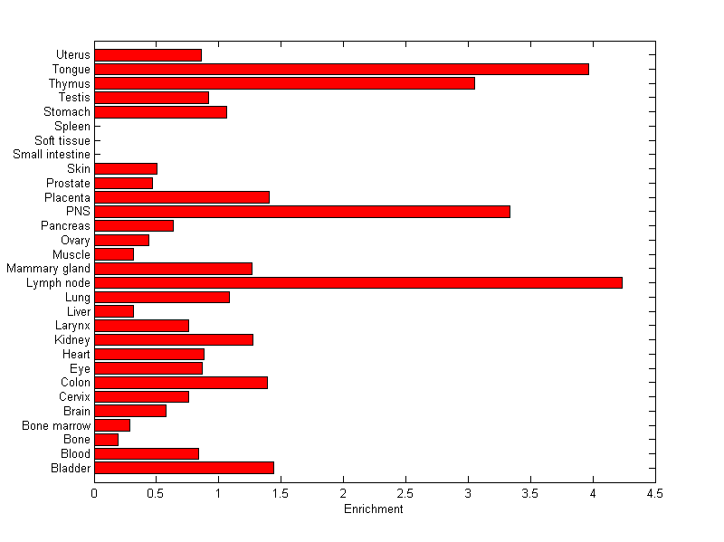 The expression level is normalized with tissue-library size. Each value for a gene in a tissue is a ratio of observed ESTs to the expected one in this tissue. The expected number of ESTs is the product of total ESTs of the gene and the fraction of total ESTs in the tissue among all ESTs in 30 tissues.