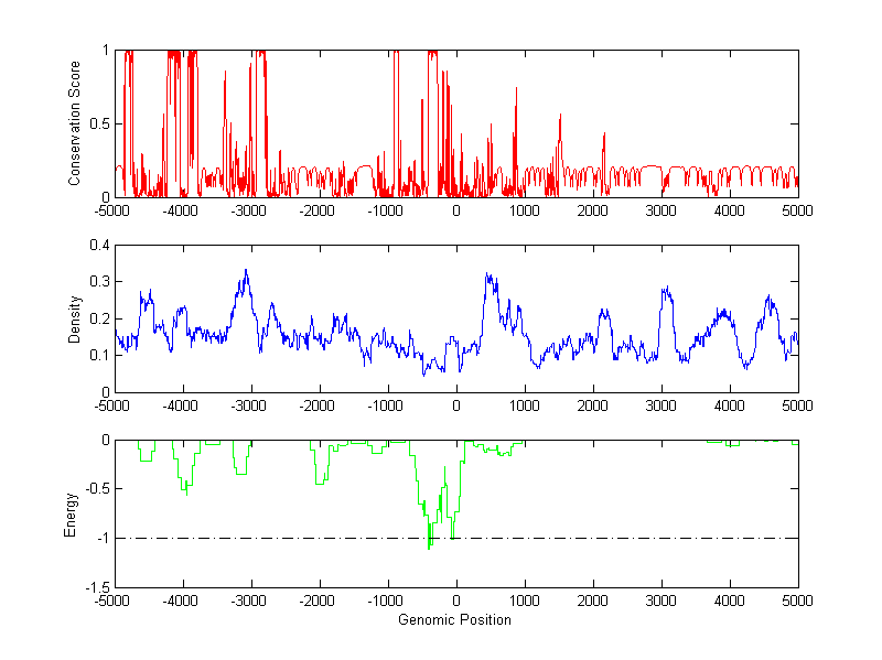 The energy profile (green curve) is about energy for module detection based on TF interaction. The positions with energy less than -1 indicate the existence of CRMs.