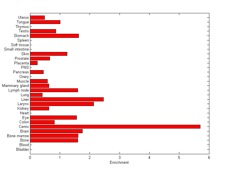 The expression level is normalized with tissue-library size. Each value for a gene in a tissue is a ratio of observed ESTs to the expected one in this tissue. The expected number of ESTs is the product of total ESTs of the gene and the fraction of total ESTs in the tissue among all ESTs in 30 tissues.